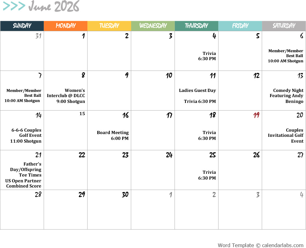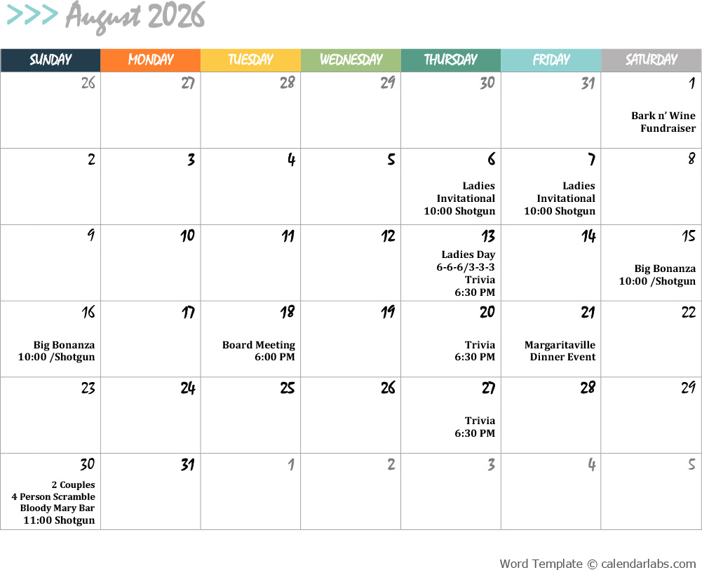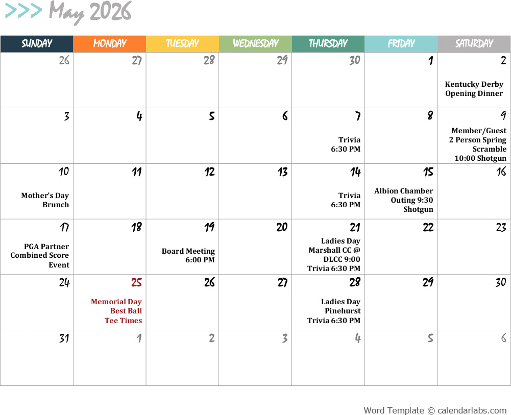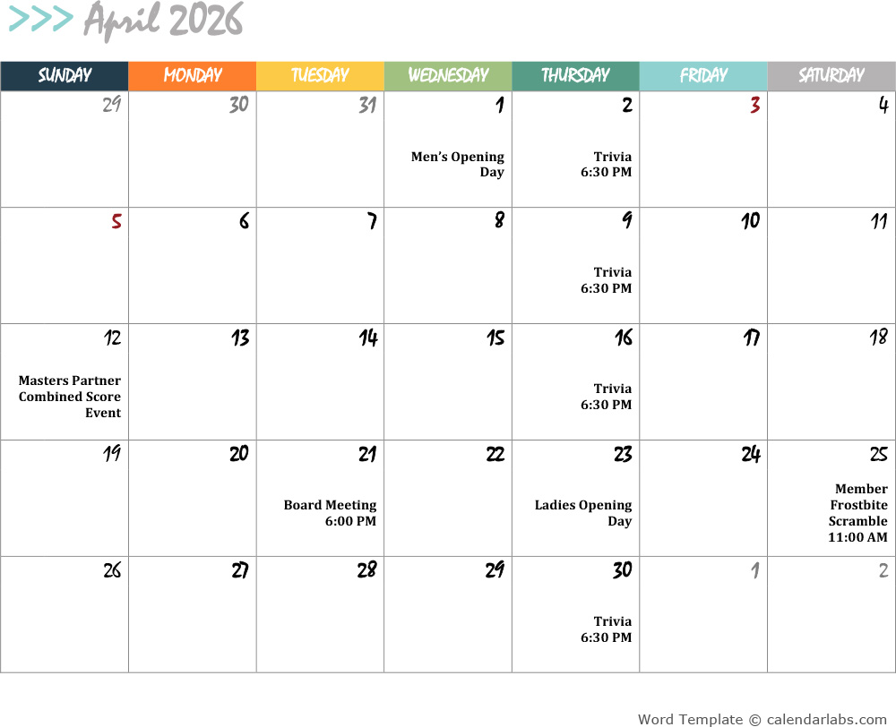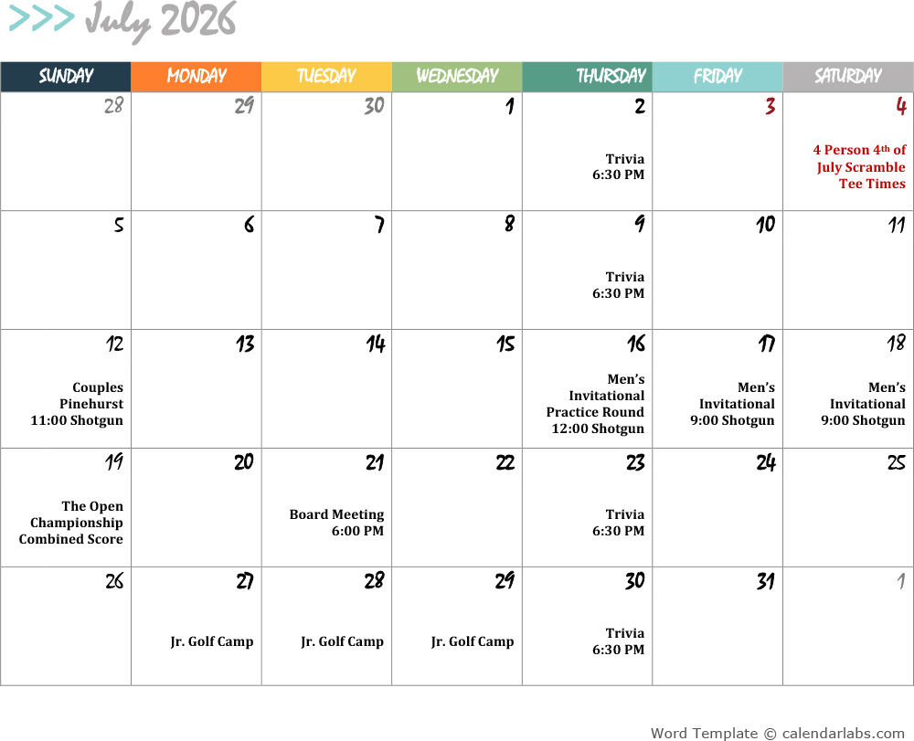 2026 Golf Calendar